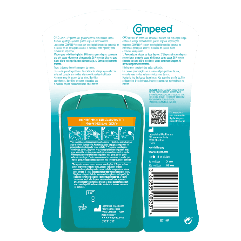 Los parches Compeed® Anti-granos* Discreto que ayudan a limpiar, disimular y proteger tus *granos, espinillas, puntos negros e imperfecciones. Los parches Compeed® Anti-granos* Discreto utilizan tecnología hidrocoloide para crear el ambiente óptimo para curar tu piel. Son parches hidrocoloides y están diseñados para granos puntuales. Además de ofrecer un protección diaria y discreta, son suaves con tu piel. Son productos de consumo general. Disponibles también para áreas grandes con tendencia a las imperfecciones.